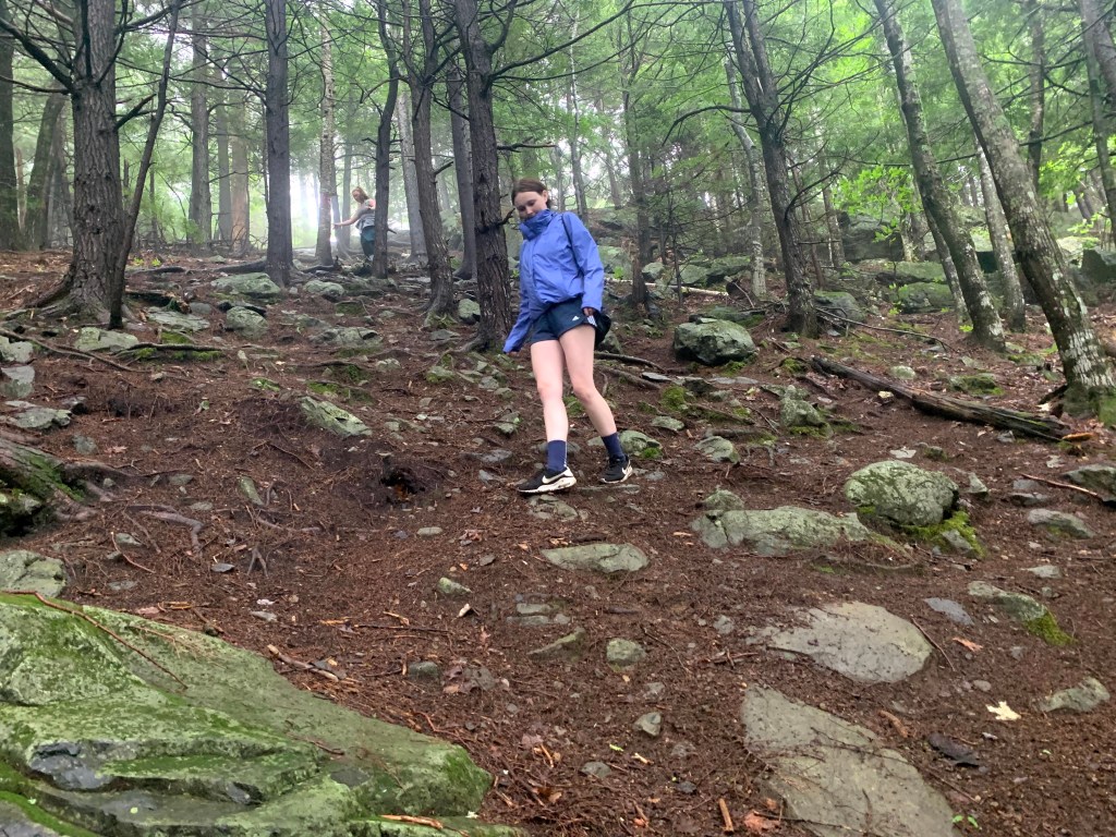 We were a bit tired driving up to the mountain, and had some trouble finding parking for the trail head. My friends, Grace and Audrey, had to go to the campsite down the road to ask where we should park our car, and we were directed to a small spot right at the start of the trail. Our original plan had been to just hike Mount Flagg, which begins at my summer camp, but the trail head was closed because camp was in session, so we needed to improvise. Once we successfully parked, we threw on our rain gear, ate a cliff bar, and began our hike.